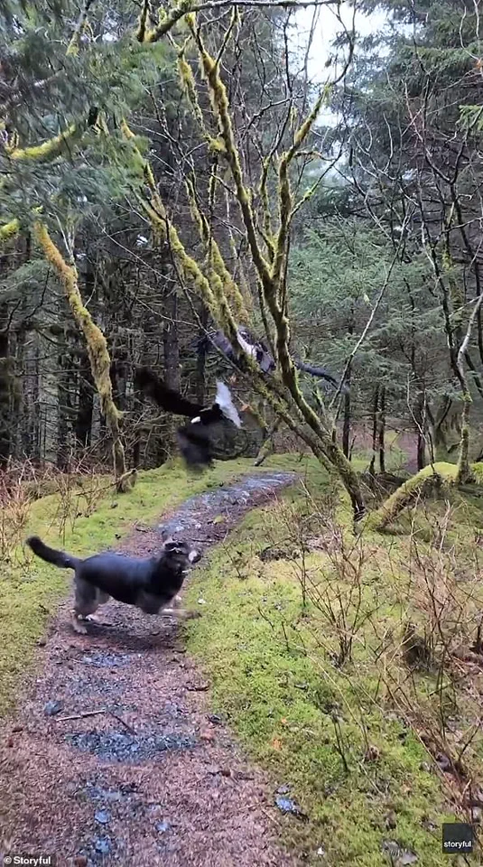 A thrilling incident was captured on camera in Kodiak, Alaska, as hiker Kerr Will stumbled upon an extraordinary sight: two bald eagles, America’s iconic national birds, entangled in a dangerous embrace high up in a tree. Will, accompanied by his dog, was out for a walk on Super Bowl Sunday when he discovered the unusual scene. The video footage shows the massive birds, with their powerful talons locked together, hanging precariously from a branch. Will’s dog barks excitedly at the sight, adding to the thrill of the moment. At first, Will thought he was looking at one large bird, but soon realized the heart-stopping truth: two adult eagles were entangled in a dangerous situation. Will’s quick thinking and concern for the birds’ safety led him to attempt finding a way to help them. This incident highlights the beauty and wonder of nature, as well as the importance of human intervention in potential emergencies.