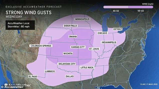 Meteorologists are predicting dangerous wind gusts throughout twenty different states on Wednesday, with some areas potentially experiencing winds reaching up to 80 mph under worst-case scenarios. Alongside these warnings, there is a heightened risk of large fires breaking out in specific regions due to dry brush and low humidity exacerbated by high winds.
