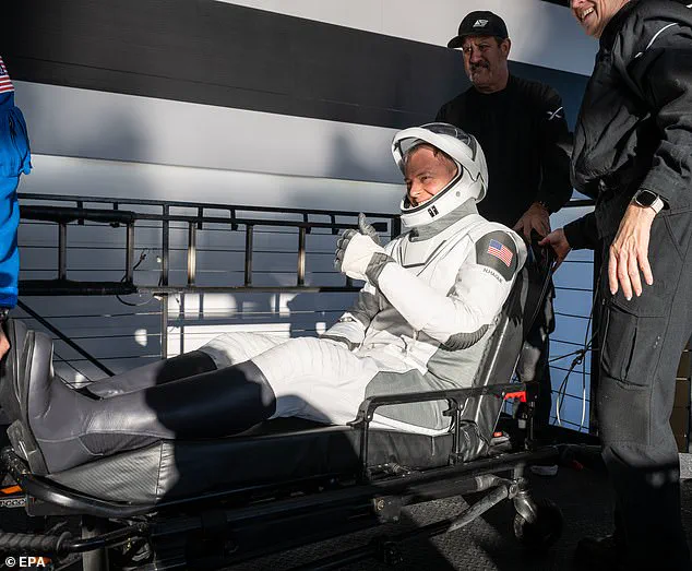 NASA astronaut Nick Hague gives a thumbs-up to the camera as recovery crews help him onto a stretcher. The situation with Williams and Wilmore gained further attention when an unnamed NASA source told the New York Post that the agency was scrambling to ‘stabilize the weight loss and hopefully reverse it.’ This concern emerged after reports surfaced about the astronauts’ dramatic weight changes during their mission.