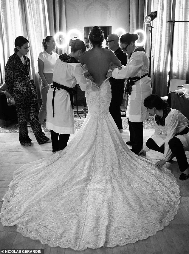 The choir’s rendition of Whitney Houston’s *Higher Love* after the vows added a spiritual dimension to the event, with Lauren Sanchez later telling *Vogue*, ‘The whole thing was like a dream.’ Her wedding gown, designed by an atelier, took 900 hours to create, featuring 180 hand-finished silk chiffon buttons and a train that seemed to stretch into eternity. ‘Every detail was intentional,’ Sanchez explained. ‘It was about telling our story through fabric and thread.’