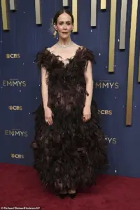 Meanwhile, Sarah Paulson, 50, arrived in a brown feathered ensemble that fluffed out into an unkempt ballooned skirt, leaving some viewers wondering if the design was intentional or a misstep.