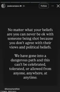We have gone into a dangerous path and this can’t be celebrated, tolerated, or allowed from anyone, anywhere, at any time.’ While the message appeared to condemn political violence, it drew sharp criticism from users who accused her of hypocrisy.