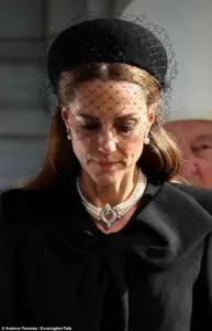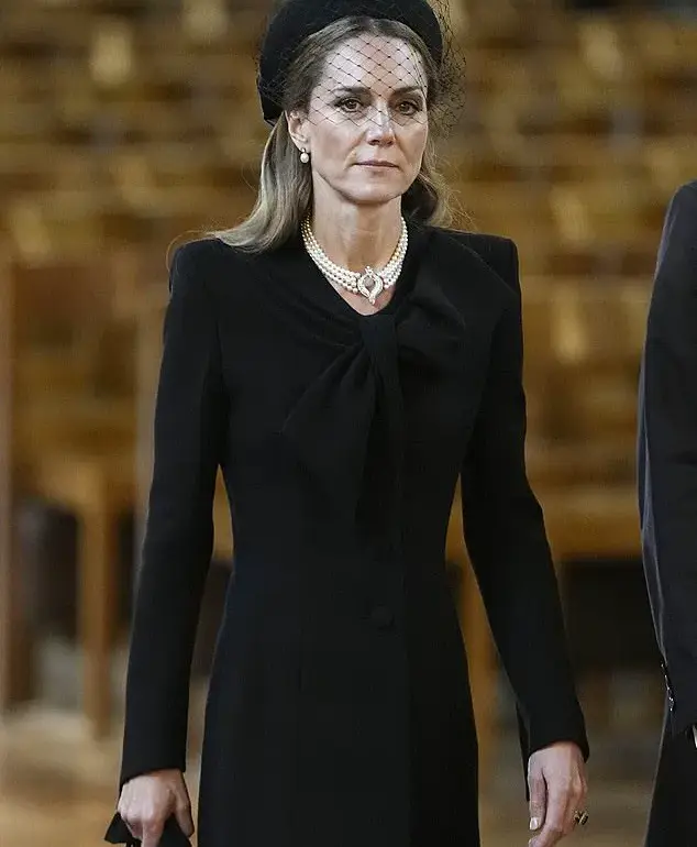 Dressed in all-black mourning attire, the royal mother-of-three wore a striking ensemble that included a pearl necklace and matching earrings once belonging to the late monarch, a piece that has become a signature of royal mourning and remembrance.