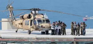 At the Re’im military base in southern Israel, Israeli military helicopters remain on standby, ready to transport the rescued hostages to medical facilities where they will receive urgent care.