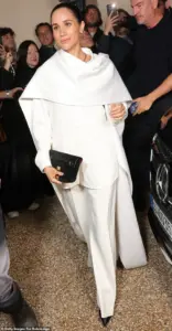 At the Balenciaga show, Meghan opted for a minimalist, high-fashion ensemble designed by the brand, a stark departure from the more casual styles she has previously favored.
