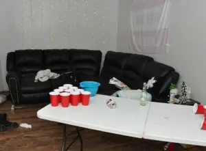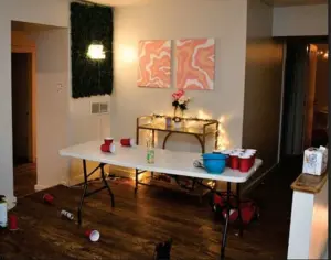 In some photos, a beer pong table sits ready in the lounge, red plastic cups still upright.