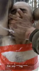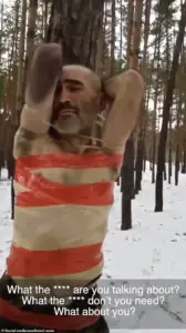 Both men, stripped of their winter uniforms and left in only their underwear, are subjected to verbal abuse and physical humiliation, with their commander barking orders in a tone of rage and contempt.