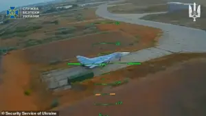 The operation, attributed to Ukraine’s SBU spy service, has sent shockwaves through Moscow, with dramatic footage capturing the moment drones struck Sukhoi and MiG fighter jets, helicopters, and even an Antonov An-26 cargo plane.