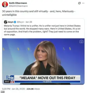 Former MSNBC host Keith Olbermann found himself at the center of a heated controversy after making a pointed jab at First Lady Melania Trump’s English proficiency following the release of her documentary.