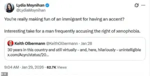 One user wrote, ‘English is her second language and she still makes more sense than you,’ while another questioned, ‘You’re really making fun of an immigrant for having an accent?’ These responses highlighted a broader frustration with what critics described as a pattern of left-wing hypocrisy, particularly in light of Olbermann’s history of criticizing right-wing figures for xenophobic rhetoric.