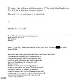 Please give her my contact details to get in touch.’ The email’s tone and content have fueled speculation about the nature of Epstein’s influence over the royal family and the extent of his connections within high society.
