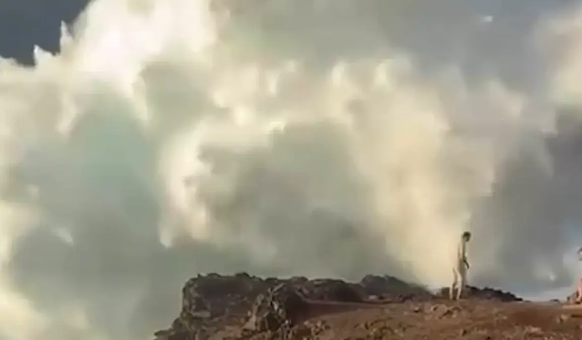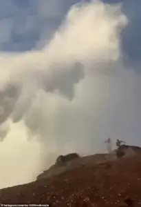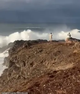 A group of tourists in the Canary Islands narrowly escaped death after a monstrous wave struck them while they stood on a rocky ledge during a storm. The incident, captured on video near the Faro de Sardina del Norte in Gran Canaria, shows the tourists ignoring warning signs and climbing over protective fencing. The cliffs here drop over 66ft, a deadly reminder of the dangers posed by the ocean. Yet, the group pressed on, phones in hand, their eyes fixed on the chaos ahead.